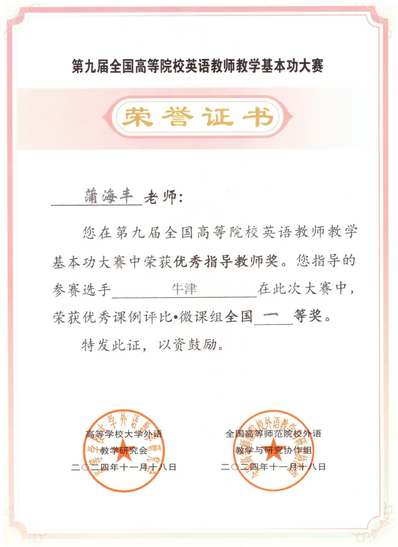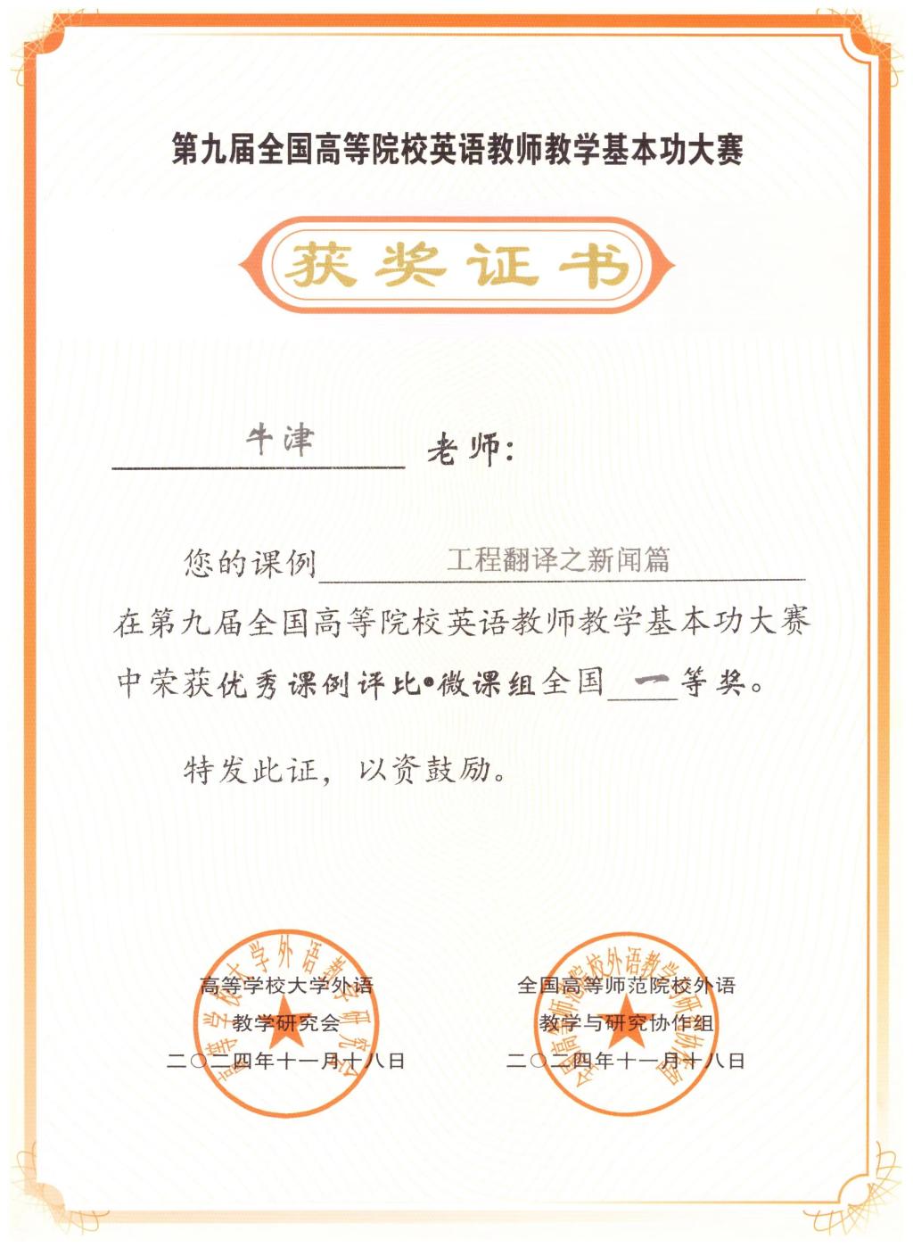 2024年全國(guó)高等院校英語(yǔ)教學(xué)學(xué)術(shù)年會(huì)暨第九屆全國(guó)高等院校英語(yǔ)教師教學(xué)基本功大賽在湖北省武漢市舉辦。我校語(yǔ)言文化學(xué)院英語(yǔ)系教師牛津榮獲優(yōu)秀課例評(píng)比?微課組全國(guó)一等獎(jiǎng),蒲海豐榮獲優(yōu)秀指導(dǎo)教師獎(jiǎng)。