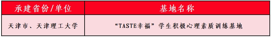 “TASTE幸福”學生積極心理素質訓練基地包含園藝心理輔導基地、明理農場心理輔導基地等戶外素拓設施,以及教育部輔導員名師工作室“GREAT生涯”工作室、天津市輔導員工作室TASTE幸福文化工作室、幸福文化體驗中心等多功能室內心理輔導場所。基地充分融合積極心理學和中華優秀傳統文化,堅持以德育心、以智慧心、以體強心、以美潤心、以勞健心融合發展的“五育育心”模式,全面培養大中小學生的六大核心素養,提升學生幸福感。
