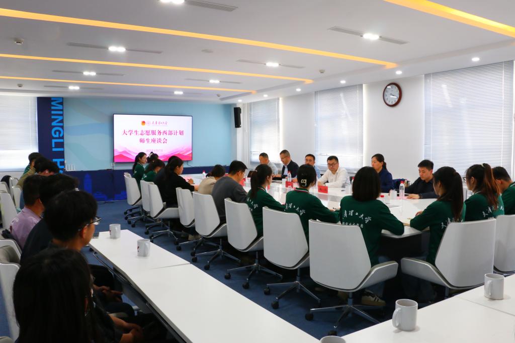團新疆區委學校工作部部長賽迪艾合買提·亞爾麥麥提,西部計劃辦公室四級主任科員呂軍臣,團昌吉州委大學生志愿服務西部計劃工作負責人馮志強,團市委學校部部長魏然和校團委相關負責同志、基層學院團委書記代表、第三屆研究生支教團代表、有意愿報名西部計劃赴新疆服務的學生代表參加座談。