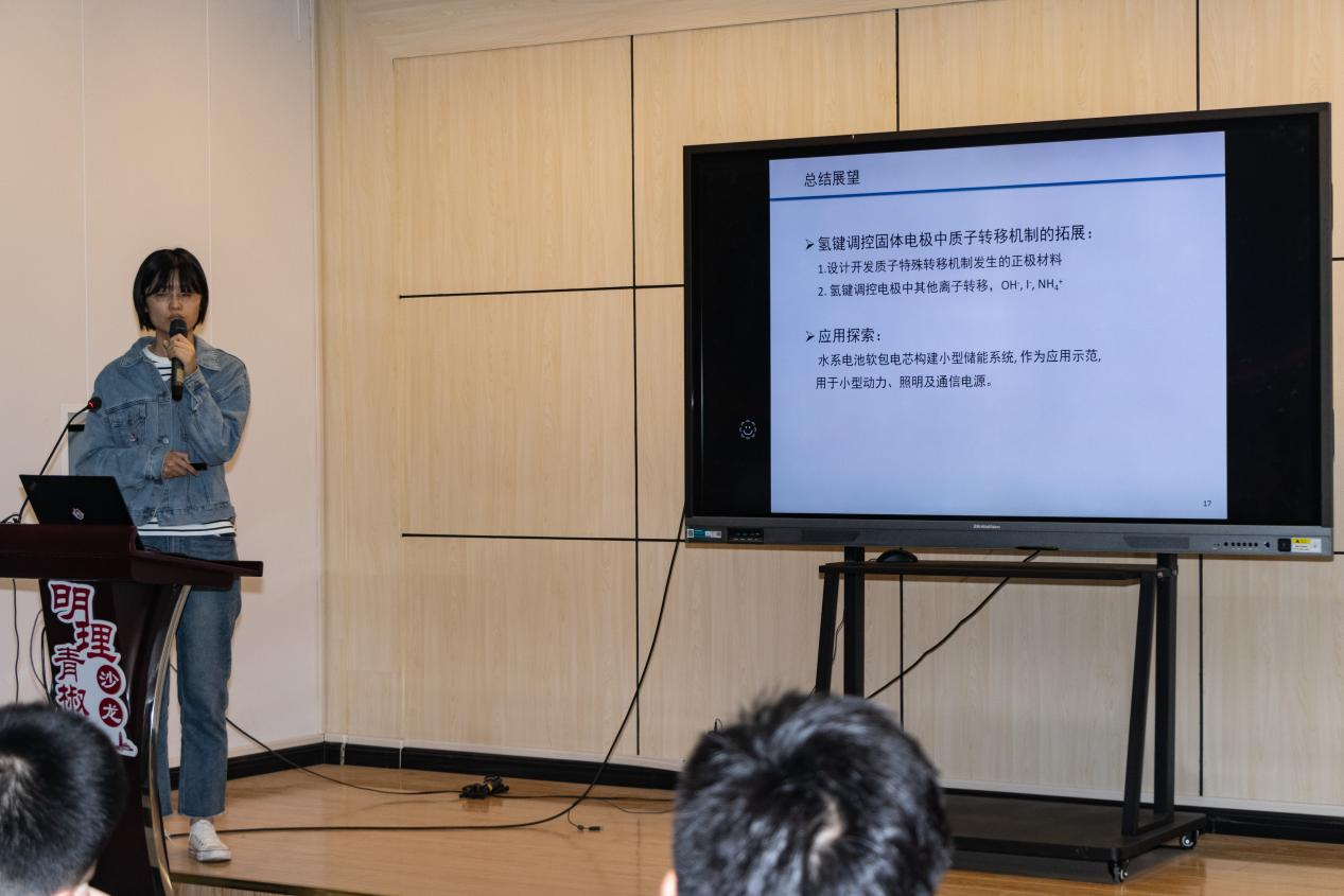 王魯魯作題為“氧化釩電極中的質子轉移機制研究”的報告。她聚焦含有大量晶格水的層狀氧化釩正極,通過理論計算和實驗表征探究質子在氧化釩層間的獨特配對選擇轉換轉移機制,提升水系電池電化學性能。
