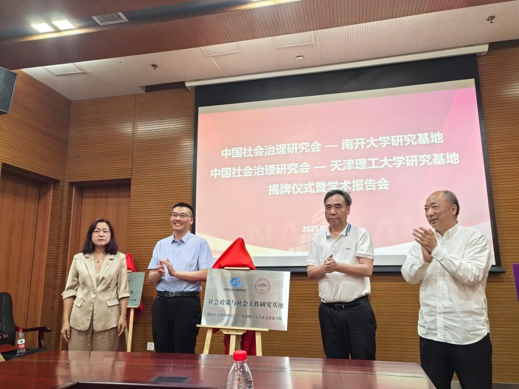 6月5日,中國社會治理研究會—南開大學研究基地、中國社會治理研究會—天津理工大學研究基地揭牌儀式暨學術報告會在南開大學社會學院順利舉行。中國社會治理研究會會長王杰秀,天津市民政局黨組書記、局長朱峰,南開大學黨委副書記牛文利,學校黨委常委、副校長蘇榮華出席活動。兩校兩院負責同志、師生代表一同參加了此次活動。