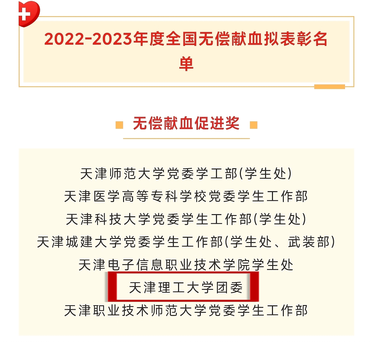近日,國(guó)家衛(wèi)生健康委、中國(guó)紅十字會(huì)總會(huì)、中央軍委后勤保障部衛(wèi)生局聯(lián)合發(fā)布《關(guān)于表彰2022—2023年度全國(guó)無(wú)償獻(xiàn)血表彰獎(jiǎng)勵(lì)獲獎(jiǎng)?wù)叩臎Q定》,我校榮獲2022—2023年度“全國(guó)無(wú)償獻(xiàn)血促進(jìn)獎(jiǎng)單位獎(jiǎng)”。這一國(guó)家級(jí)榮譽(yù)的獲得,是對(duì)我校長(zhǎng)期以來(lái)踐行社會(huì)責(zé)任、弘揚(yáng)人道主義精神的高度肯定,更是全體天理師生無(wú)私奉獻(xiàn)的生動(dòng)體現(xiàn),我校已連續(xù)6次獲此殊榮。