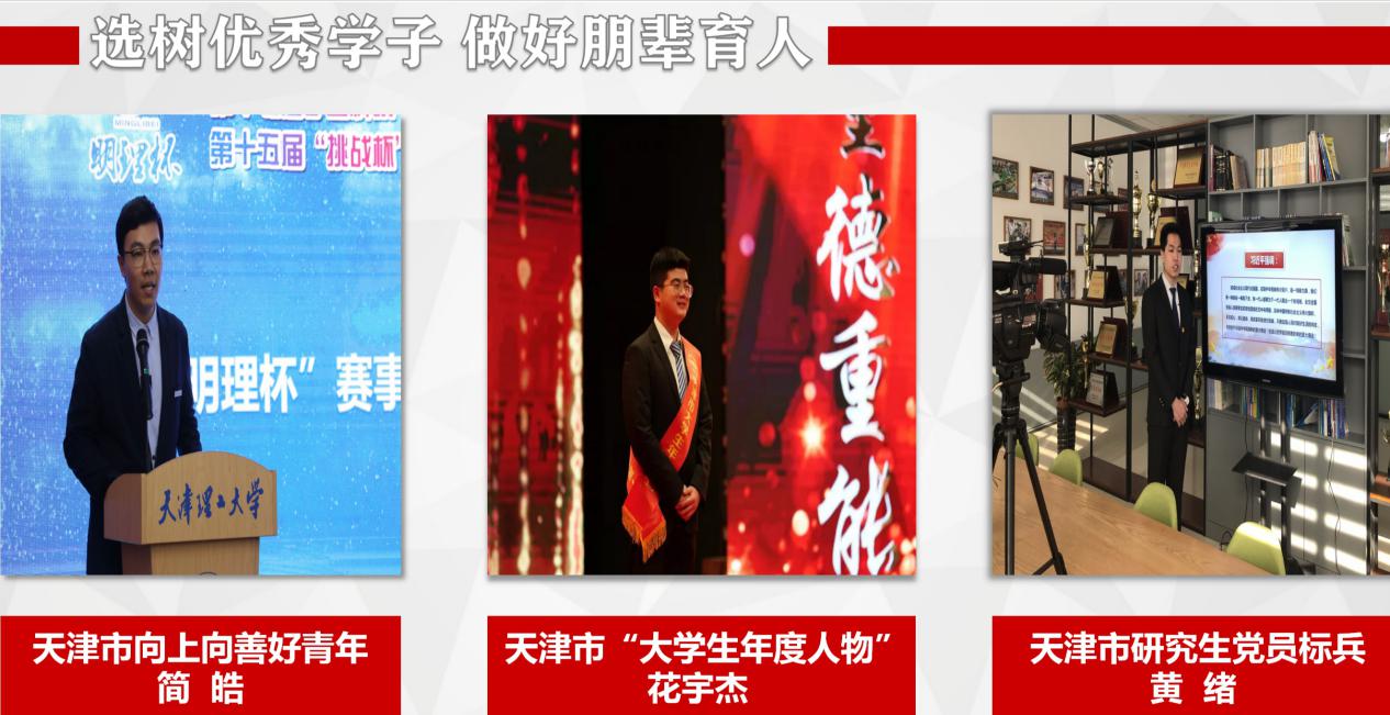 電氣電子工程學院始終以培養愛國主義精神和改革創新精神為主線,完善學院思政大格局,夯實思政教育主陣地,落實立德樹人根本任務,找準“三全育人”工作落實落地的結合點和著力點,持續推進和延伸“十大育人體系”建設和內涵。近年來組織申報并成功獲批全國黨建工作標桿院系建設單位,天津市黨建工作標桿院(系)、研究生黨建工作標桿院(系)建設單位,1個教工黨支部獲批全國黨建工作樣板支部。