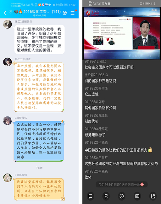廣大天理師生積極響應,思政理論課教師組織學生們紛紛通過電腦、手機相聚云端,聆聽這場特別的思政課堂,并通過QQ群、微信群、網絡會議平臺展開熱議,分享彼此的聽課感受。