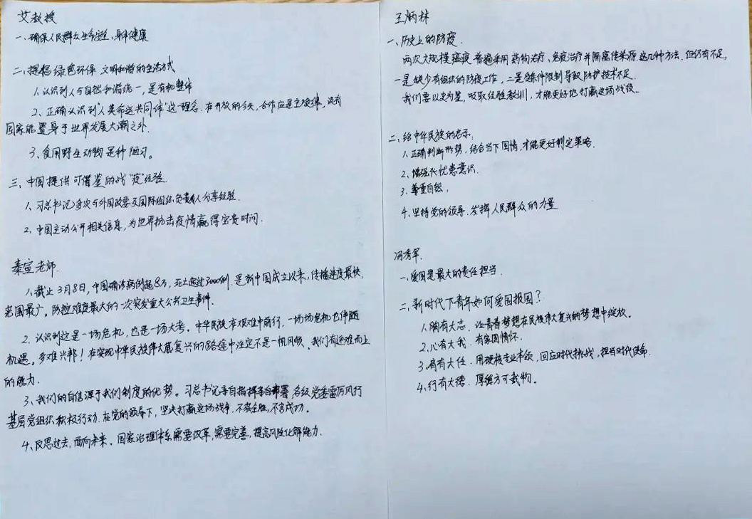 四位專家教授結合疫情形勢為全國大學生講授“疫情防控思政大課”十分必要且重要,使我深化了對當前形勢下深化理論研究、中國所面臨的偉大斗爭、中華民族從磨難中奮起的歷史和啟示、青年一代的歷史使命和責任擔當等問題的認識。通過積極組織3個班300余名同學觀看直播課程,就專家提到的問題,如“人與自然的關系”、“人類命運共同體的重要性”、“中國共產黨在疫情中起到的作用”、“青年人的社會責任擔當”等問題與學生進行討論,更為深入地向學生傳達中國特色社會主義制度的顯著優勢及其在疫情當前發揮的效用,進一步堅定青年學生的理論自信、制度自信。