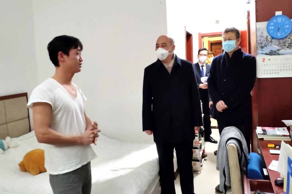校領導走進留學生宿舍查看,仔細詢問留學生學習和生活情況,叮囑同學們做好科學防護措施,不要恐慌,不外出、不聚集,保持個人衛生,配合學校堅決打好疫情防控阻擊戰。