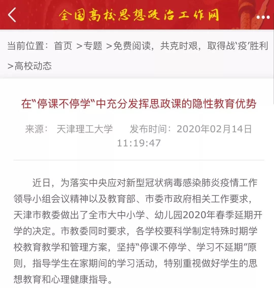 我校馬克思主義學院講師,天津市高校習近平新時代中國特色社會主義思想研究聯(lián)盟成員侯靜婕以“在‘停課不停學’“中充分發(fā)揮思政課的隱性教育優(yōu)勢”為題撰寫了理論文章,這篇文章同時被全國高校思想政治工作網轉載。