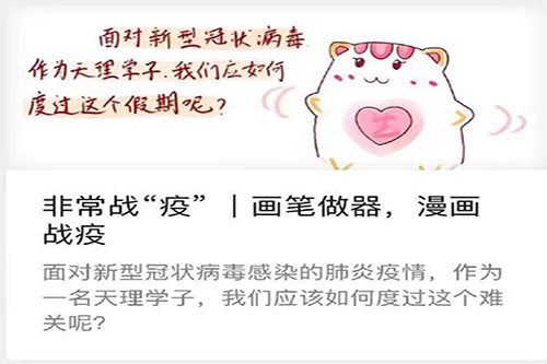 面對當前疫情防控特殊時期,學工隊伍積極探索網絡思政教育新思路新方法,堅持做好宣傳教育工作,引導學生理性關注疫情,不傳謠、不信謠,保持健康、穩定的身心狀態,堅定戰勝疫情的信心和決心。學工部微信公眾號“天理學工”每天發布師生原創推文,轉載官方權威信息,全力做好學生科學防疫知識普及、思政引導、心理疏導等工作。發布“同力協契共克時艱——致學校全體學生的一封信”“錘煉政治品格 踐行使命擔當——致學校全體學生黨員的倡議書”“致全體天理輔導員的一封信”,鼓勵廣大學生和輔導員隊伍堅定必勝信心,科學面對疫情,弘揚正能量;通過“少年易老學難成,一寸光陰不可輕”“這個假期,天理人的抗‘疫’行動”“武漢,我們春暖花開見”“開卷有益小編薦讀”“運動有益輔導員帶你一起居家健身”等輔導員原創微文、手繪作品、運動視頻等,引導學生養精蓄銳,合理規劃假期生活;發出“藝術戰‘疫’”主題作品集結號,引領天理學子心手相牽,合力戰“疫”!