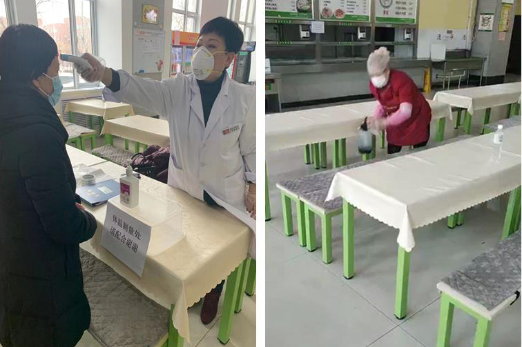 在膳食服務保障方面,在食堂入口處設置體溫測量處,體溫測量合格后方可進入餐廳,要求就餐師生飯前用消毒洗手液洗手。鼓勵師生將餐食打包帶離餐廳分別就餐,減少聚集。加強餐食供應質量,早餐提供牛奶、雞蛋等,午晚餐增加菜品種類,并免費提供水果,增強在校師生的抵抗力。每日早餐和晚餐閉餐后對餐廳進行全覆蓋式消毒。此外,膳食中心每日安排食品安全管理人員檢查后廚衛生和加工操作,了解食材庫存,并及時儲備,確保師生用餐安全可靠。