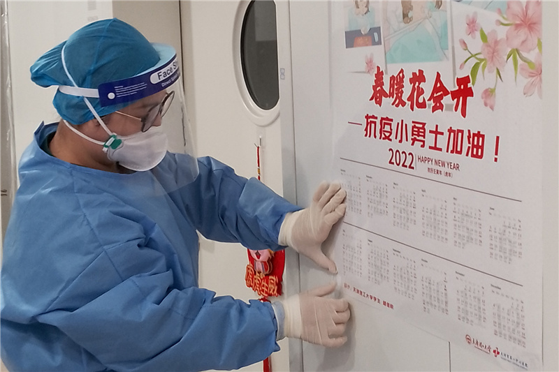 一中心醫院醫護人員將天津理工大學學生設計的“春暖花會開,抗疫小勇士加油!”2022年年歷張貼在醫院的樓道內。
