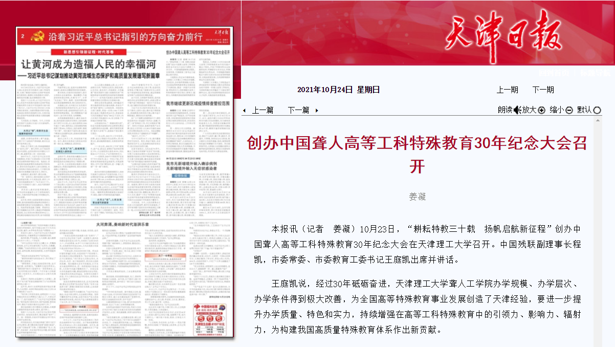 10月23日,“耕耘特教三十載 揚(yáng)帆啟航新征程”創(chuàng)辦中國(guó)聾人高等工科特殊教育30年紀(jì)念大會(huì)在天津理工大學(xué)召開(kāi)。中國(guó)殘聯(lián)副理事長(zhǎng)程凱,市委常委、市委教育工委書(shū)記王庭凱出席并講話(huà)。