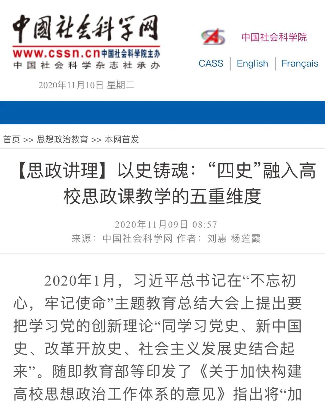 11月9日,《中國(guó)社會(huì)科學(xué)網(wǎng)》思想政治教育專欄刊發(fā)了我校馬克思主義學(xué)院劉惠、楊蓮霞老師撰寫的《以史鑄魂:“四史”融入高校思政課教學(xué)的五重維度》理論文章。
