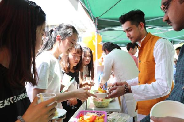 活動現場還設置了各國展示區,中國的粽子、印度的咖喱飯、土庫曼斯坦的抓餅烤馕、泰式雞油飯、日式飯團等極具特色的傳統美食吸引著各國學生前來品嘗。大家一邊體驗美食,一邊豎起大拇指點贊,氛圍歡愉和諧。